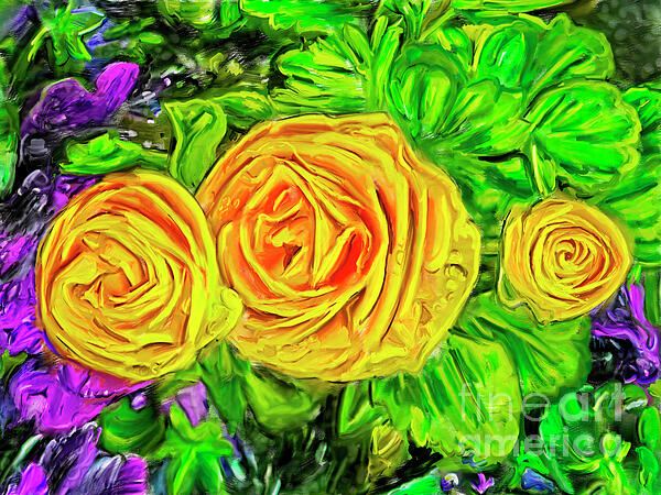 Vibrant yellow Ranunculus blooms are at the center of the frame surrounded by lush green foliage and a few hints of purple flowers. I took the photograph and rendered it as a digital painting. I use filters with some of the digital paint renderings, but I did this one by hand so I could get the precise broad brush strokes just the way I wanted them. The brush stroking was done with an electronic pen and tablet.